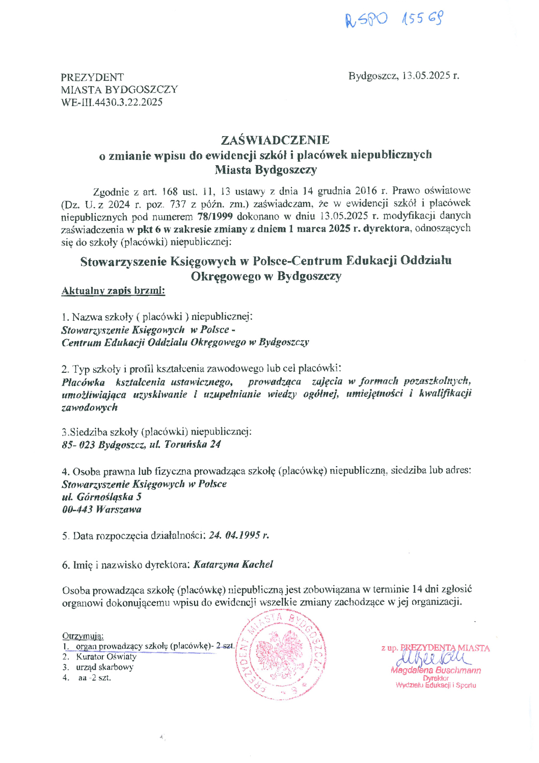 Stowarzyszenie Księgowych w Polsce Centrum Edukacji Oddziału Okręgowego w Bydgoszczy legitymuje się wpisem: